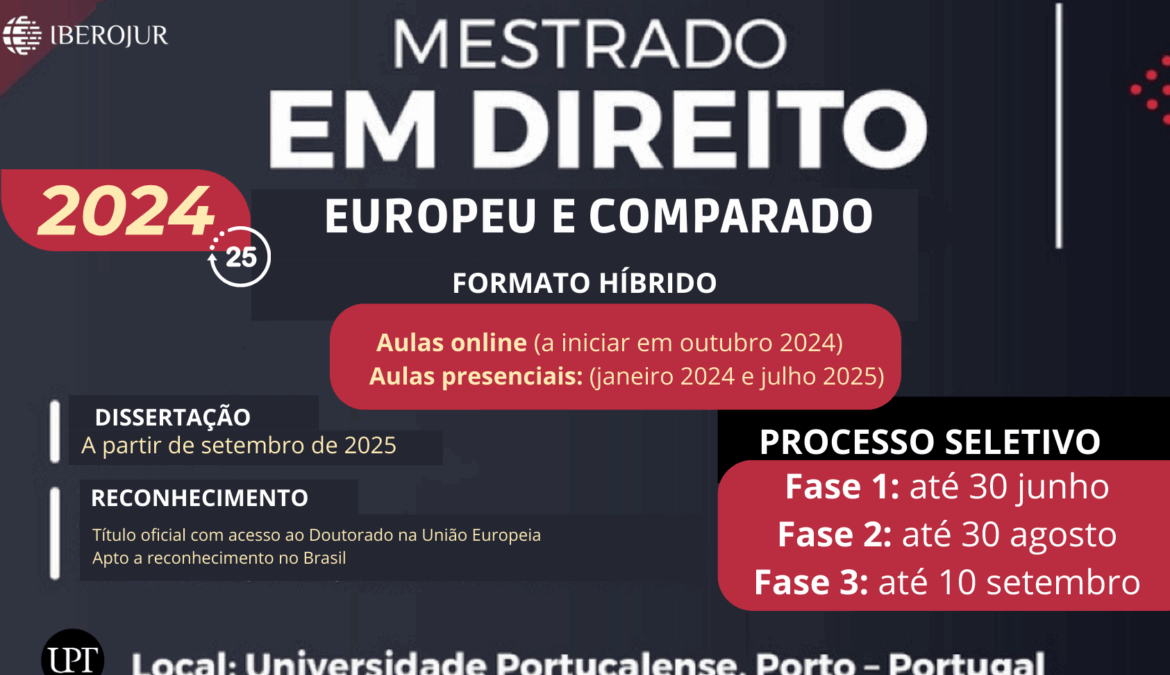27 de abril de 2024Processo Seletivo do Mestrado em Direito Europeu e Comparado, modalidade híbrida (online e presencial), na Universidade Portucalense, Porto – Portugal.